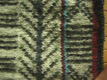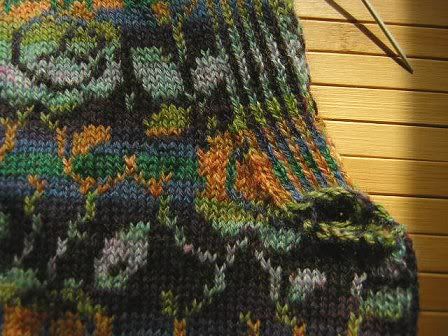 Ich bin so gut wie fertig mit dem Körper. Jetzt stellt sich die Frage, ob ich mich erst den Ärmeln (die ich gemeinsam mit Steek in der Runde stricken werde) zuwende oder erst die ungeliebten Blenden stricke. Am besten, ich nähe mal die Steeks ab...