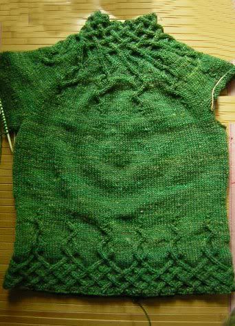 Das ist ein wenig schmeichelhaftes Zwischenstandsfoto von Wisteria (seht ihr diese Beule in der Mitte?), und ich weiß auch nicht, ob es mit Inhalt besser wirkt. Der Pulli ist wirklich unglaublich dick und warm - echt eine Art Mantelersatz. Von der Taillierung sieht man im Augenblick auch gar nichts, wahrscheinlich weil die schwankende Garndicke das zunichte macht. (seufz)