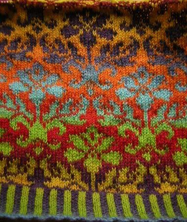 Das Muster ist aber leicht zu stricken. Und so schön! Schwertlilien. Irre, wie der dunke Hintergrund dann hell wird...