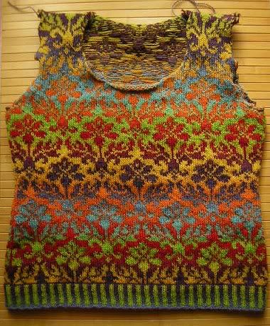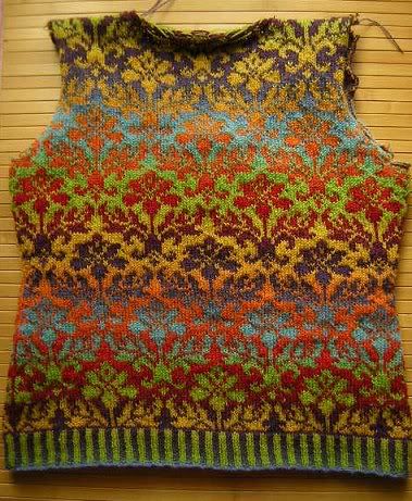 Von der Seite sieht die Kennerin, dass ich nur fünf Steek-Maschen genommen habe. Bei dem störrischen Kauni reicht das. Sonst nehme ich immer sieben. Aber bei einer Jacke würde ich auch mehr nehmen, an der vorderen Kante, meine ich. Das wird bald der Fall sein, wenn ich die anderen Kaunis in Braun und Blau in Betrieb nehme...