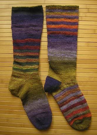 Riesen-Aufwand, Riesen-Gemurkse. Weil mir beim ersten Socken nach einer Weile das simple "Ich-genieße-den-Farbverlauf" zu langweilig war, habe ich die Reste auseinandergerissen (in der Mitte war sowieso ein Knoten) und neu verteilt. Im Stilgefühl der frühen Siebziger Jahre (räusper).