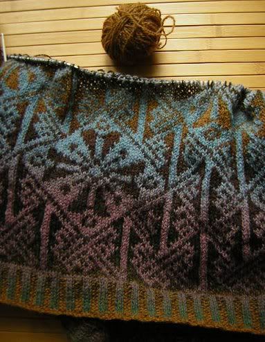 Die Jacke wird diesmal ein Sack. Nur bei den Armausschnitten werde ich eine Ecke einarbeiten und die Ärmel ein wenig näher an den Schultern annähen. Aber es bleibt ein Sack. Das passt einfach am besten zu dem Muster. Da gibt es keine Alternative (wenn man erst nach einem etwa DIN A4 Chart eine Wiederholung hat...)