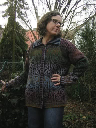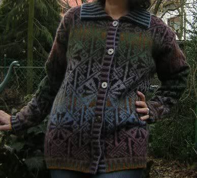 Hier die unrühmlichen Fotos der Lindisfarne-Jacke. Aber bequem ist sie. Stimmt schon, da passt noch ein Pulli drunter - auch ein dicker :hihi: Und ausgerechnet um den Bauch und die Hüften herum sind die hellsten Farben - man weiß ja, dass das nicht eben schmeichelt ;)