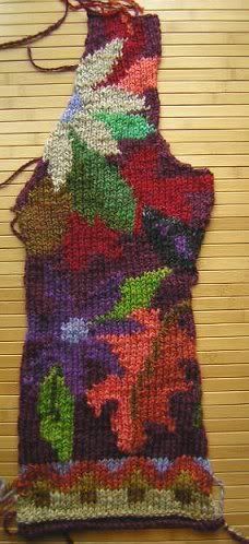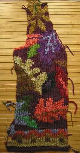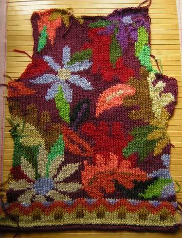 Bis in die Nacht hinein habe ich - alle Vernunft hinter mir lassend - weitergemacht und dann sollte das Rückenteil auch noch fertig werden! Auch die Fäden (außer jenen an den Rändern, die ich zum Teil einknoten kann) sind vernäht. Und gewaschen habe ich das Teil auch, damit es etwas regelmäßiger wird. Doch die Knubbel auf der Rückseite und das schlampig gesponnene Garn ;) machen das Ganze etwas unregelmäßig. Wie immer bei Intarsien - mit Nadelstärke 5.