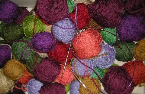 Zur Technik: Ich verwende tatsächlich "normale" Knäuel, liebe Soma, keine "Garnpuppen". Die Fäden sind nach einer Hinreihe alle entwirrt und verkreuzen sich bei der Rückreihe auf solche Weise, dass sie in der nächsten sich wieder auflösen. Nur wenn neue Farben/Fäden eingefügt werden oder eine Farbe zu Ende ist, verkreuze ich schnell die Knäuel.
