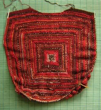 ...und beim Stricken des Drops-Jäckchens, hier das stillgelegte Rückenteil - man sieht schon die Schultern. Inzwischen habe ich beschlossen, die Rückseite als Außenseite zu verwenden, denn dort zeigen sich keine so harten Grate an den Seiten des Quadrates. Das sieht schöner aus. Eine andere Änderung betrifft den rückwärtigen Halsausschnitt, den habe ich etwas abgeschrägt, nicht so eckig wie angegeben.