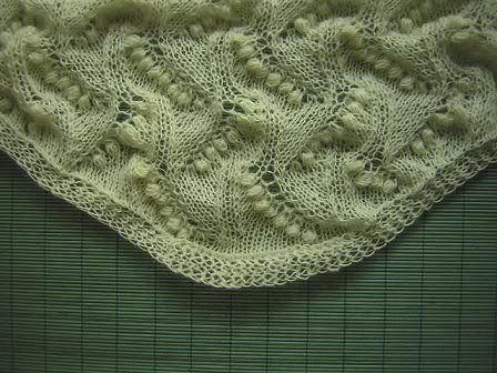 Das Tuch selbst war "kleine Fische". Und ich habe auch unten einen schöneren Abschluss hingekriegt, indem ich die Kante auf Lace-Strickerinnen-Art unten an die ca. 20 Rest-Maschen angestrickt habe und (links, man sieht's) eine Naht im Maschenstich gemacht habe.