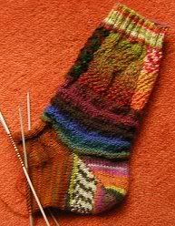 Mir hat es gar nicht gefallen, dass die so kurz geplant waren. Nicht mit mir! Schließlich habe ich ordentlich viele kleine Reste. Auch die nachträgliche Ferse muss nicht sein. Ich habe eine stinknormale mit verkürzten Reihen gemacht. Nur in einer Farbe bis zu den Zehen zu stricken ist mir unter diesen Umständen auch zu langweilig. Bald werde ich Farbe (und Strukturmuster) wechseln. Nur die Nähte am Fuß, die habe ich mir dann doch geschenkt. Ob ich so wie Tammina auch Frankenstein-mäßige Pathologen-Nähte mache, das glaube ich nun doch nicht. Dafür bin ich zu faul.