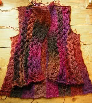 Da liegen zwei Vorderteile auf dem bereits gespannten Rückenteil. Die werden heute noch am Kragen zusammengenäht und dann auch nass gemacht. Bleibt mir nun nichts anderes übrig, als jedes Teil einzeln zu spannen, aber das war es schon wert, denn diese Lochmuster werden halt doch immer viel größer als zuvor vermutet. Und wenn ich nun die Ärmel meiner Vorstellung entsprechend ändere - lang und völlig anders geformt - dann sollten die nicht bis zu den Knien reichen. Passt schon alles ... mit Purple, aka Rød, aka Maple Leaves...