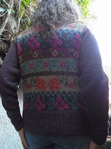 Das Modell war aus einem Rowan-Heft. Gestrickt habe ich mit 2,5er Nadeln und Drops Alpaca. Von dem violetten Garn habe ich fünf Knäuel gebraucht, für die anderen Farben haben Reste genügt.