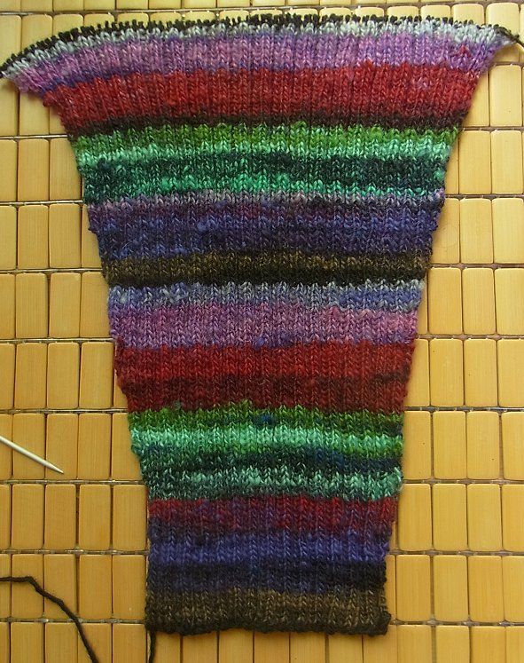 Nachdem der erste Teil des Auftrags fertig war, konnte ich mich nicht mehr halten, es musste was von dem Noro-Imitat ausprobiert werden. Für den Ärmel habe ich einfach mal geraten und an der Anschlagkante die nötige Maschenzahl bestimmt, dann weiter, erst mal ein Stück Rippen geradeaus. Dann erkannt, dass das Rippenmuster vielleicht insgesamt die richtige Wahl ist und entsprechend der Erfahrung beidseitig jede 6. R zugenommen.